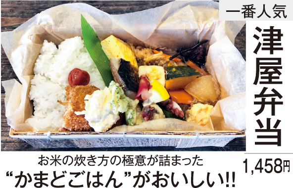 | かまどで炊くごはんと、地元の魚の定食が人気のWAKAYA津屋。自慢は、マグロカツ、灰干しさば、季節魚の南蛮漬け、だし巻き卵、豚肉じゃがなど、おかずをたくさん詰め込んだ津屋弁当。注文を受けてから手づくりします。電話予約すれば受け渡しがスムーズ。晩ごはんにおすすめの、単品おかずもあります。 |