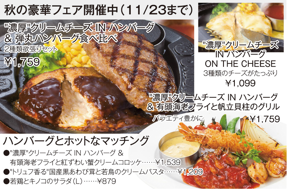 | 朝に晩に肌寒さを感じる季節は、クリームチーズがたっぷりつまった、あつあつハンバーグでキマリ。人気の弾丸ハンバーグと食べ比べたり、フライやグリルとのコンビで味の違いを楽しんだり。秋の豪華フェアは、パスタやサラダも充実し色んなマッチングを試せるチャンス。11月24日からは冬フェアも始まります。 |