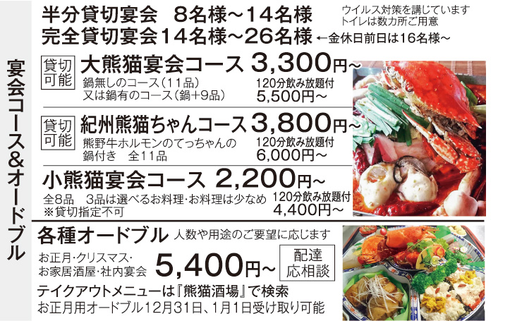 | おいしい料理とお酒で大いに盛り上がる、&熊猫酒場の宴会。今年は貸切宴会はもちろん、半貸切宴会が可能になりました。塩津のしらす屋さんから直接届く新鮮なしらす、産地直送のイノブタや熊野牛、醤油はこだわりの湯浅醤油を使用。《和歌山自慢の美味》をふんだんに使っています。オードブルも評判です。 |