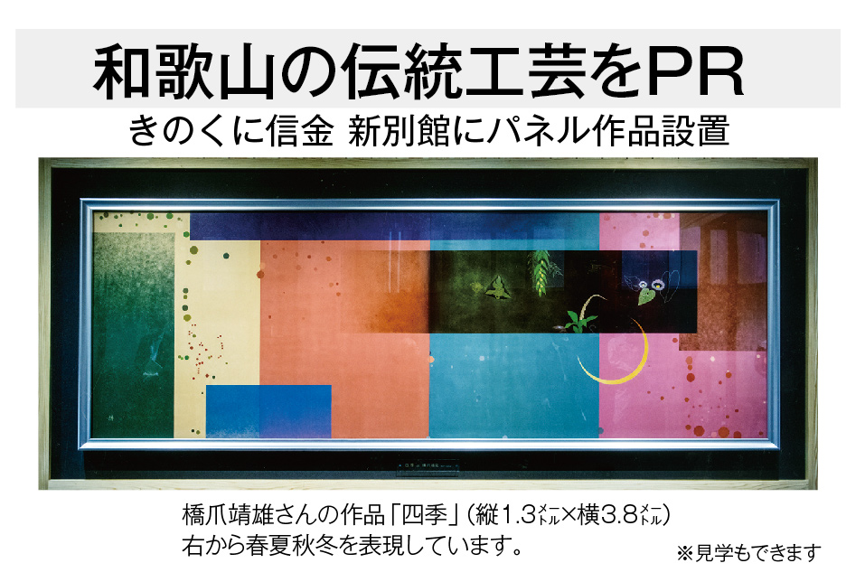 | 3月27日、きのくに信用金庫の新別館に、地場産業をPRする漆器作品が設置されました。県内外の来客に和歌山の伝統工芸の素晴らしさを知ってもらおうと、同信金が海南市の漆芸家・橋爪靖雄さんに依頼。四季を表現した4枚のパネル作品は迫力いっぱいながら繊細かつ華やかで、来館者を魅了しています。 |