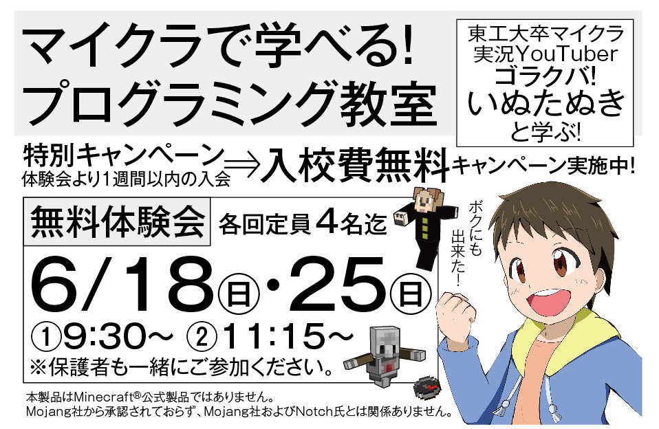 | 世界中で人気を集めるビデオゲーム「マインクラフト」を使ったプログラミング教室「コードアドベンチャー」が和歌山に登場!! 東工大卒マイクラ実況YouTuberいぬたぬきが監修した教材で、論理的思考能力を育てます。ゲーム感覚で試行錯誤することが、学ぶ意欲を刺激。無料体験会&説明会を開催します。 |