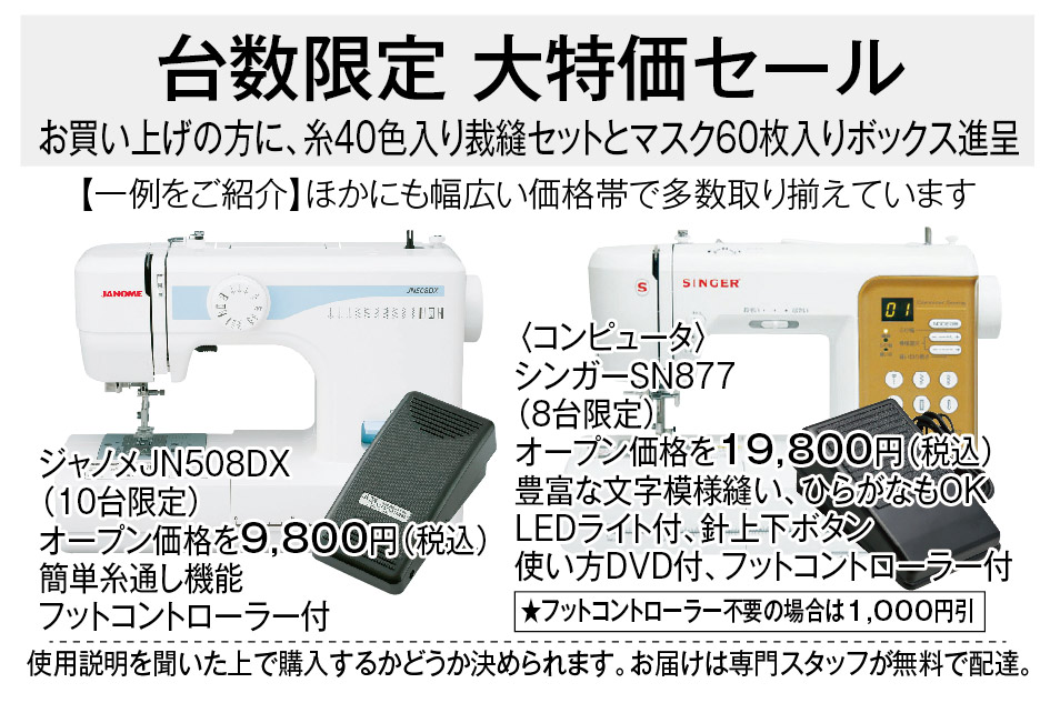 | 信頼と安心の本格的ミシン専門店「ミシン工房」が8月18日まで、「台数限定大特価セール」を開催中。いずれの機種も使い方簡単、初心者におすすめ。コンパクトタイプや実用縫いもできる本格派など、多彩に品揃え。3本糸ロックミシン29,800円のほか、刺しゅうミシン、職業用ミシンを格安販売しています。 |