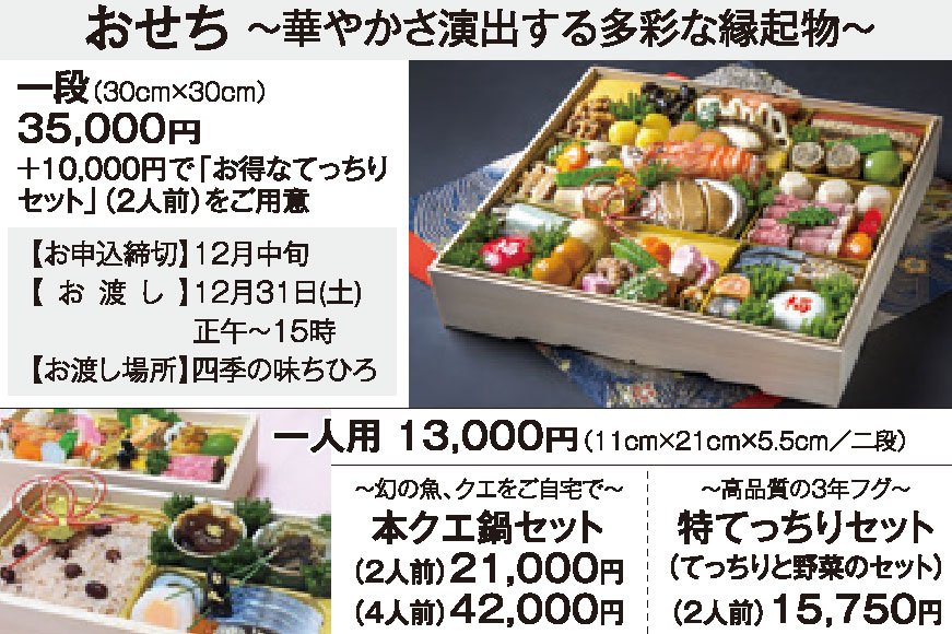 | 一流料理人が厳選した食材と伝統の技が詰まったおせち。子持ち昆布、田作り、黒豆、車海老を始めとする「和」の縁起物と、ローストビーフなどの「洋」が、彩り豊かに華やかさを演出します。少しずつ楽しみたい方には、赤飯が入った1人用おせちも人気。本クエ鍋と一緒なら、心も体もほっこり温まります。 |