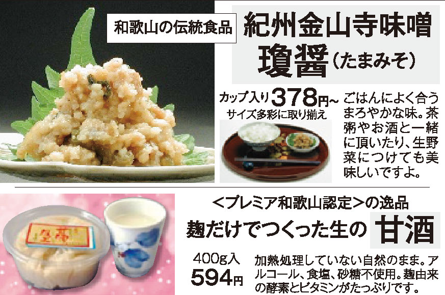 | 「金山寺味噌」は、米・はだか麦・大豆などを混ぜ合わせた、野菜たっぷりの“食べるお味噌”。甘口まろやか、豊かな風味と優れた栄養価が近年見直されています。川善味噌堀止直売店では、製造直送の金山寺味噌を販売。プレミア和歌山に認定された「甘酒」は、健康や美容を気づかう方に好評です。 |