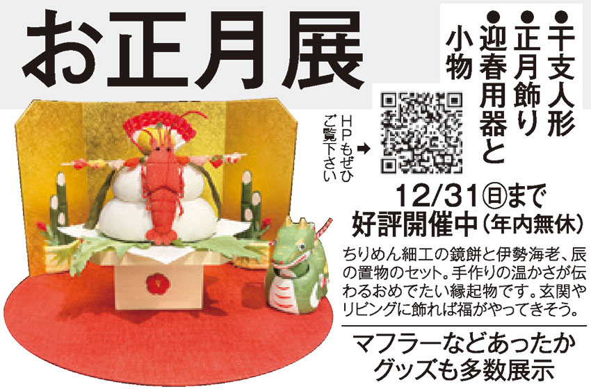 | 暮らしの器と布「けやき」では12月31日㊐まで、「お正月展」を好評開催中。ちりめんや和紙の干支人形、水引飾りのほか、お正月用の花器やポチ袋など、やさしくて華やぎのある和のアイテムがいっぱいです。クリスマス用のギフトや季節のあったかグッズも勢ぞろい。年内無休。HPもぜひのぞいてみて。 |