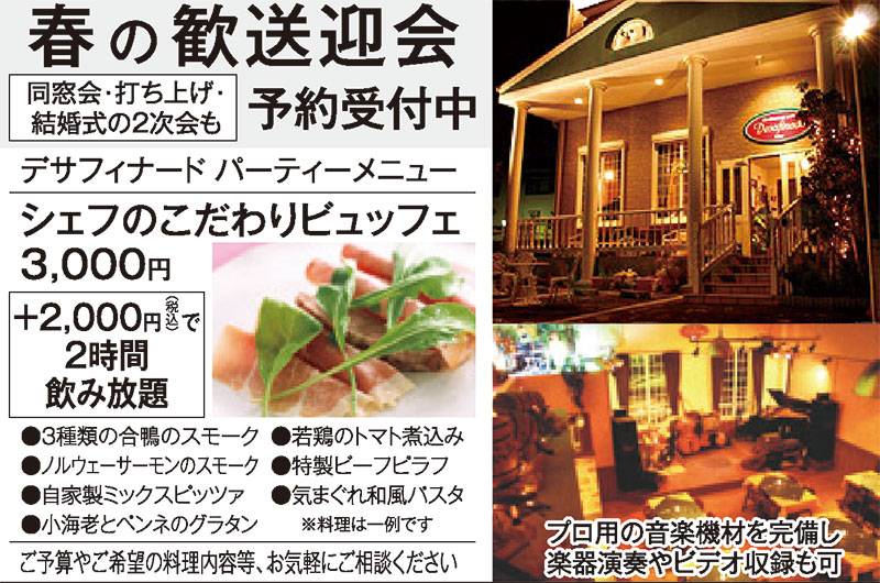 | 卒業や入学、就職に転勤と、出会いと別れが交錯する春。貸し切りパーティができるオシャレなレストラン・カフェ「デサフィナード」で歓送迎会はいかが? シェフのこだわりが詰まったビュッフェ料理と美味しいお酒を楽しみながら、プロジェクターで思い出の写真や動画を映せば、思い出に残ること間違いなし。 |
