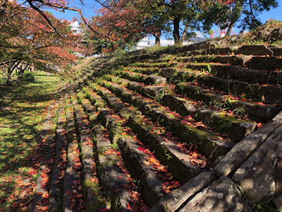 城内の各所に見られる雁木は地味です。しかし、蔵ノ丸の雁木ほど見事なものは、和歌山城にしか見られないと言っても過言ではなく、見所のひとつに挙げられます。(水島大二・日本城郭史学会委員)。