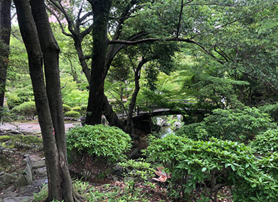 ところが庭園内に入るとついつい堀池の方に足が向いてしまい、庭園西端の高台にまで足を運ぶ人は少ないのではないかと思います。その高台には、茶室の「水月軒」と離れ座敷の「聴松閣」という建物がありました。