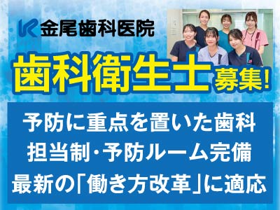 アルバイト・パート正社員金尾歯科医院【新卒・既卒歓迎】歯科衛生士・正社員募集! 担当制・予防ルーム完備!最新の働き方改革に適応!