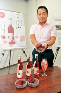 ルビー色に輝く梅シロップはいかが? 海南市藤白の酒造会社、中野BCは県果樹試験場うめ研究所と連携し、皮と果肉が赤い梅の新品種「露茜(つゆあかね)」を使ったシロップ「つゆあかね」を9月16日に発売した。
