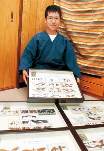 絶滅が心配されるフクロウの仲間、アオバズクについてユニークな研究を進める中学生がいる。海南市野上中の東海南中学校1年、宗尚輝さん(写真)が着目したのは、エサとなる虫や鳥などの食べられない部分を取り除く際に出る食痕(しょくこん)。2ヵ月以上にわたって調べ標本にまとめた。「アオバズクは里山にいる虫を中心に食べていることから、里山の自然環境が重要だと改めて分かりました」。研究内容は2月28日(日)の「生物多様性フォーラム」で発表する。