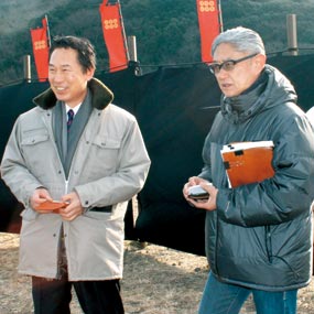 写真上=加太で行われた大坂夏の陣の撮影。同下=撮影現場にかけつけた尾花市長(左)と堤監督