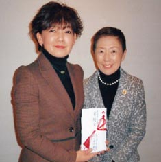 りらの山上範子校長(写真左)に目録を手渡した市川静代会長は「りらの生徒さんはいい子ばかり。よりよい学生生活の一助にしてほしい」と望んでいる。