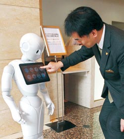 同ホテルは、「お客様が和めるきっかけに」と2月に導入。客が近づくと視線を合わせて手を上げ、「ホテルで働いているペッパーです」「かわいいね」などと声をかける。胸のパッドを操作すると、早口言葉を話したり、腰をふってダンスをしたり。人の表情を読み取り、喜怒哀楽のバロメーターをテストする機能もある。