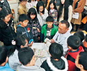 中谷医科歯科病院の中谷匡登(まさと)院長は、外科手術で行う傷口の縫合を紹介。初めに鶏肉を使って実演し、結び方を説明した。子どもたちは机に固定した2本のひもで練習した。中谷さんは「病院だけでなく、海外や離島の医療が不足している地域、スポーツ選手の体調管理など様々な場面で働くことができる職業です」と語った。受講した福井春陽(はるひ)くん(小3)は「ひもを結ぶのが難しかったけれど、最後にはできるようになってうれしかった。本が好きなので本屋さんの授業も受けました」とにっこり。