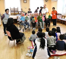 訪問したのは80~90代の4人。たいようの花で月1回、紙芝居や体操指導などをする同市の松居昌子さんの提案がきっかけだった。当日は、童謡『めだかの兄弟』『いぬのおまわりさん』『七つの子』などを歌い、人形をダンスさせて見せた。入居者の90代女性は「初めは緊張しましたが、子どもの笑顔に癒やされ、やり遂げられてよかったです。練習を重ねたい」とにっこり。