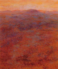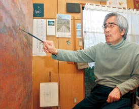 受賞作の「高原」は、中村さんが過去に写生したり、趣味の山登りで見た景色から心に刻み込まれた風景を取り出して描いたもので、この通りの場所はない。手前に広がる草原の向こうにある山は「龍門山のイメージを借りてきました」。赤系統の色を基調としたのは「70歳を超え、人生のたそがれを表現したかった」と明かす。