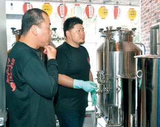 写真上=ビール造りに挑む平和酒造の髙木さん 同下=店内に醸造所を構えた紀州応援酒場三代目