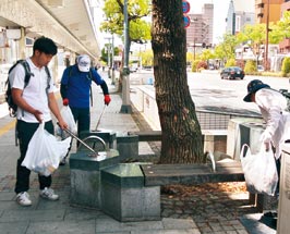 4月22日に実施した第1回は4人が参加。歩数計をつけ、和歌山市中之島の県立体育館~和歌山城の往復約4・5㌔を歩いた(写真)。約2時間で大きめのレジ袋8袋分のペットボトルや吸い殻などが集まった。「一人ひとりが自分たちできれいにしていこうとすれば、もっと活気あふれるまちになるはずです。健康づくりはまちづくりでもあると思います」と同財団。