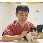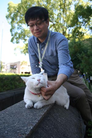写真=猫館長のご機嫌をうかがう近藤学芸員