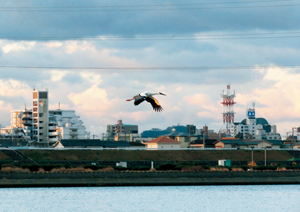 今回、市が「和歌山市にコウノトリが来ているのを知ってもらいたい」と観察を続ける市民の有志8人に協力を求め、写真展を企画した。和歌山コウちゃんが巣にたたずむ姿や、遠く和歌山城をバックに川の上を旋回する姿(写真)など豊かな水環境で暮らす様々な和歌山コウちゃんの表情を見ることができる。また、龍神村の造形作家、溝端秀章さんが4ヵ月かけて制作した、新聞紙アートの和歌山コウちゃんもお目見えする。