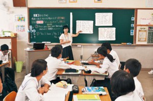 西脇中学校(和歌山市西庄)の永田佳子教諭はその一人。教科書での学習に加え、身近な出来事を習った文法で表現することに時間を割く。「自分の言葉を英語で伝える喜びを知り、自信がなくても話そうとする姿勢を伸ばします。従来の黒板に書いて学力を高める授業と、生徒自身が考えて学力をつける授業のバランスが大切」