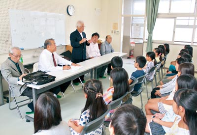 男声合唱団ほえーるに所属する70、80代の団員4人が20日、和歌山市楠本の川永小学校を訪問。国語の授業で戦争中の話「ちいちゃんのかげおくり」を習っている3年生62人に戦争体験を語った。
