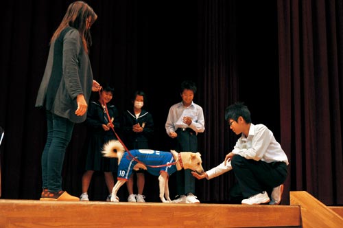 和歌山市でボランティア犬として活動するもか吉が10月28日、同市北島の河北中学校を訪れた。飼い主の吉増江梨子さんが取り組みを話し、命の大切さや活動の楽しさを伝えた。吉増さんは「動物を物のように見ず、尊い命や感情があると実感してほしい。ペットと一緒にできる社会貢献を知り、参加する子が増えてゆけば」と願っている。