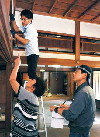 写真上=小谷三恵子さん(左下)の立ち会いで調査を進める 同下=昭和初期建築の庫裡