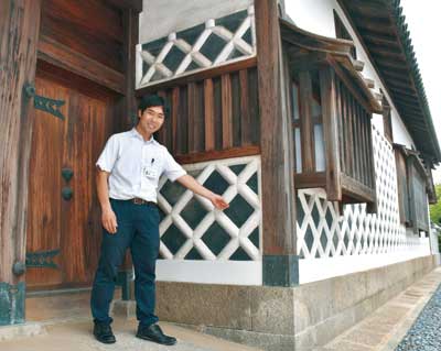 長屋門は18世紀後半~19世紀初めに同市東坂ノ上丁に建設されたとみられる。紀州藩士、大村弥兵衛の家の一部で、門と住居が一体となっており、使用人の住まいとして使われた。平屋で一部2階建て、間口23㍍、奥行き5㍍。海鼠壁や梁(はり)に使われた木材のほか、瓦も可能な限り江戸時代のものを使う。かんぬきを支える金具や門の下部に装飾が施され、武家屋敷の格式の高さがうかがえる。