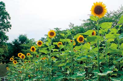 犠牲になった子どもたちを心にとどめようと、遺族らが学校近くでひまわりの世話をしており、和歌山県内でもその種を譲り受けた小学校を中心に広がっている。緑花センターにはひまわり約700本が咲くが、このうち、大川小の種から育てたのは、パノラマ花壇と東入園口近くの計約200本。2㍍以上に生長し、大きな花で来園者の視線を集める。8月上旬まで楽しめる見込み。