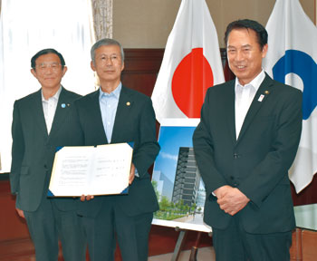 2021年春に和歌山市七番丁の伏虎中学校跡などに開設予定の和歌山県立医科大学薬学部に関し、県と和歌山市、県立医大が8月31日、県庁で連携・協力協定を締結(写真)。県は財政的、技術的協力、市は用地の無償貸与、医大は優れた薬剤師の養成を約束した。