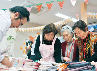 買い物を楽しんだのは、入居者22人と地域住民。商品を手に取り、鏡の前で体に合わせ、買い物かごがいっぱいになる人もいた。岩橋陽子さん(76)は「上着がほしいと思っていた。明るい色が好きなので、気に入るものを探します」。携帯電話を取り出し、「いっぱいあるで、買いにけえへん?」と知人を誘う人や、友人のかごを見て「あれー、ぬくいの買うちゃあらよー」と買い物を楽しむ声が響いた。