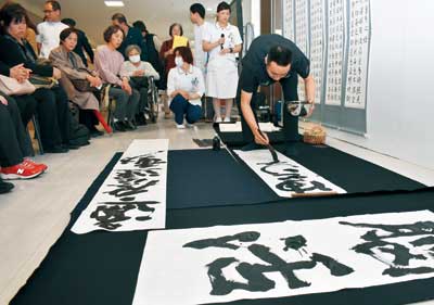 日赤和歌山医療センター(和歌山市小松原通)で11月8日、「認知症予防」をテーマに、書道準師範の腕前を持つ糖尿病・内分泌内科部の廣畠知直医師が書道パフォーマンスを行った。