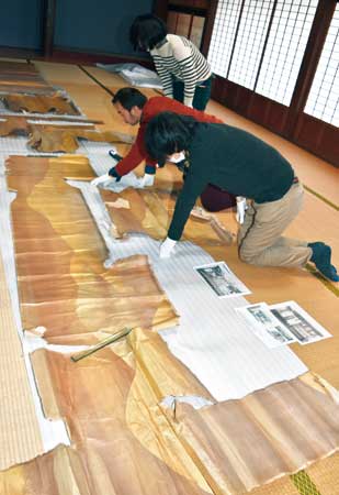 写真上=和歌山県立近代美術館の学芸員が調査、同下=床の間の障壁画