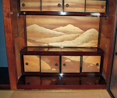 西の間より大きく描かれており、12月5日に調査した県立近代美術館の藤本真名美学芸員は「障子を開くと、外から日の光が入り、絵が光るように配置され、当時はきれいに見えたと思います。高貴な人を迎える建物になるよう図ったのがうかがえます」。奥村一郎学芸員は「1922年に皇太子だった昭和天皇が和歌浦に来ており、そのタイミングに合わせ作ったのでは」と推論。「建物ともども貴重」と語る。