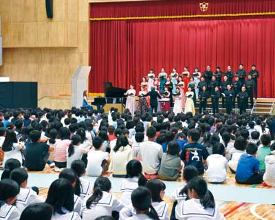 伏虎中学校と本町、城北、雄湊の3小学校が統合し、城北小と城北公園跡で伏虎義務教育学校として4月にスタートした。公立の小中一貫校は和歌山県内初。1~4年の基礎定着期、5~7年の充実期、8・9年の発展期とし、5年から英語や理科などで教科担任を導入した。(写真=全学年一緒に音楽鑑賞)