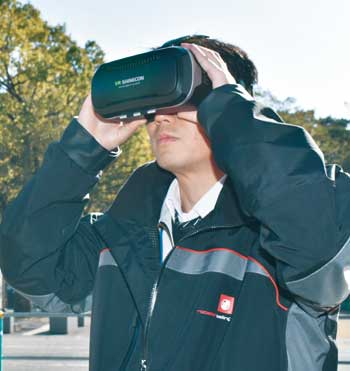 写真=ゴーグルをのぞくと、アプリ内で再現された江戸時代の和歌山城の画像を見られる