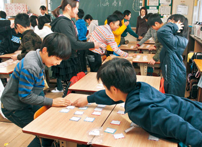 1月23日に和大生からカルタ取りのルールや古語を学び、競技用カルタを自作した。30日はそのカルタを使い、2人1組でカルタ取り。児童は勢いよく札を取る音を教室中に響かせた。西山昊佑(こうすけ)くんは「8対11で負けちゃったけど、気に入っている『田子の浦の〜』の札は取れました」とにっこり。