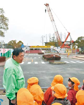 春は交通公園へ遊びに来て──。一昨年から道路工事のため敷地の3分の1が使えず、来園者が減っている交通公園(和歌山市西)は、工事用に持ち込まれた高さ約50㍍の巨大クレーンの解説を始めた。山本彰一園長は「交通安全教室で解説しています。めったに見ることのできない大きなクレーンを間近に感じられます」と話している。