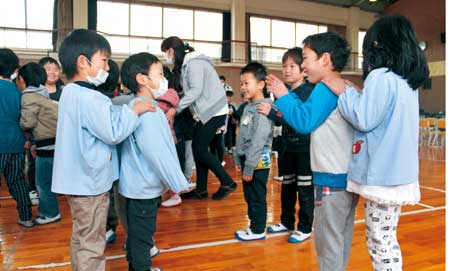 1年の西浦琉ノ亜(るのあ)さんは「鍵盤ハーモニカを家で練習して、うまく演奏できました。喜んでもらえてよかった」、巽幼稚園の前北晃太朗くんは「じゃんけん列車で1回目に負けちゃったけど、お兄ちゃん、お姉ちゃんと遊べて楽しかった」と笑顔を見せた。