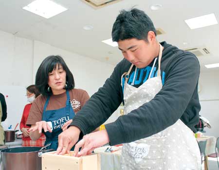 2月9日はブラジルとパラグアイからの留学生2人に豆腐作りを指導した。馬場マテウス健市さんは「豆腐を作ったのは初めて。にがりを直接なめるととても辛く、海の塩の味がしたけど、豆腐になるとおいしかった」、松宮クリスティアン淳さんは「パラグアイでも祖母が豆腐を作っていましたが、プレスは機械。木枠で絞るのは初挑戦でした。これからは豆腐作りを手伝えます」と笑顔。