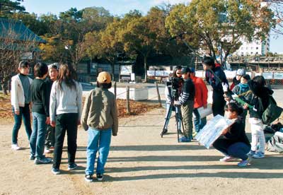 昨年11月に撮影を始め、校内のほか、和歌山城、友ヶ島、玉林園の店舗を回った。カメラ担当の池尾涼太郎くんは「友ヶ島は役者が走っているところを、後ろと横の2つのアングルで撮りました。景色をバックに走る様子と、役者の横顔を映せてよかった」。和歌山城での監督を務めた山田旺義(おうぎ)くんは「城を案内したり、困っている人を手伝ったりするおもてなし忍者の様子を盛り込みました。絵コンテの段階では良さが出せず、脚本を練り直しました」。