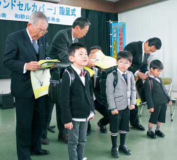 和歌山県交通安全協会は3月8日、4月に小学校へ入学する児童に黄色いランドセルカバーを贈った。