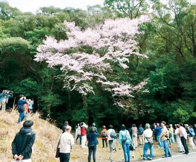 3月18日、古座川町で開かれた和歌山県主催の説明会には約80人が参加。見ごろを迎えたクマノザクラの前で、調査に当たった森林総合研究所、勝木俊雄さんの説明に耳を傾けた(写真)。
