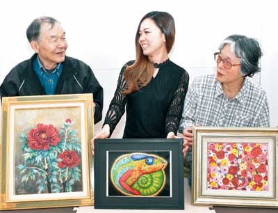 20歳で油絵を始めた溝田哲夫さん(83、同左)は、和歌山県展、和歌山市展をはじめ、これまで多数入賞を重ねる。哲夫さんに影響を受けた久子さん(82、同右)は68歳、井上さんは28歳で絵筆を握った。画材の使い方や構図、色のバランスなどを哲夫さんから指導を受け、描き進むうちにしっくり来ない時は、アドバイスを求める。久子さんは「家に先生がいたのでよかった。孫の作品は自分たちにないアイデアで驚かされます」と目を細める。