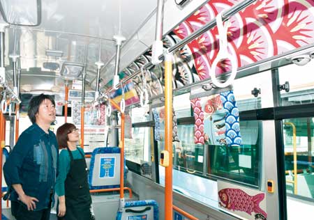 車内がこいのぼりのイラストや模様で埋め尽くされた〝こいのぼりバス〟がお目見えした。和歌山市本町の人形専門店をぐらやの広告で、和歌山バスの1車両が運行している。をぐらやの森田亨弘社長は「住宅事情などの影響でこいのぼりをあげる家は激減しているが、日本の伝統行事や季節を感じてもらいたい」と望んでいる。