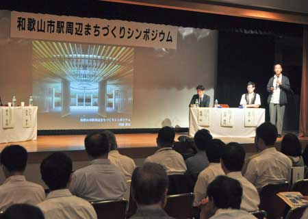 建て替え工事が進む南海和歌山市駅ビルと駅周辺の今後を語るシンポジウムが5月23日、和歌山市民会館で開かれ、関係者や市民約250人が参加した(写真)。同市と南海電鉄主催。尾花正啓市長は「市駅は交通結節点であり市の玄関。駅周辺のまちづくりが街の未来につながる」と強調した。