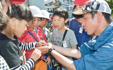 平井さんが市堀川に関するクイズ形式の授業を実施。この後、市堀川の遊歩道で和歌山県立自然博物館の揖善継学芸員からカニカゴや投網を使った捕獲方法を学んだ。前日の夜から仕込んでいたカゴには残念ながら何も入っていなかったが、揖さんらが午前中に捕まえたマハゼとボラのほか、フタバカクガニとフナムシを見せた。子どもたちは興味深そうに見つめ、「意外とかわいい」と笑顔で手に取る子もいた。