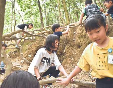4年の井戸本陽向(ひなた)くんは「自然のジャングルジムみたい。木登りが楽しい」、5年の中拓人くんは「きのこ、たけのこ、イノシシの足跡など、いろんなものを見つけます」とにっこり。